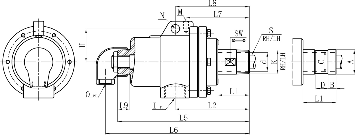 | Model | K | I | O | S | d | L1 | L2 | L5 | L6 | L7 | L8 | L9 | M | N | H | SW | 法兰式外管尺寸对照表 | |||